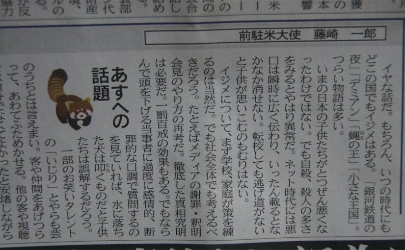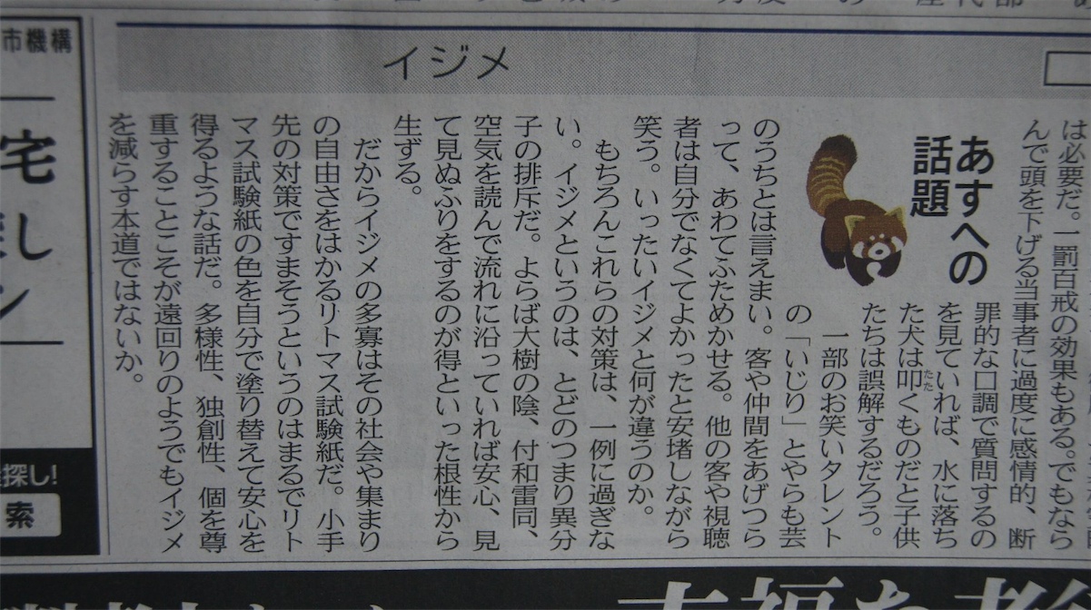 ブログ 「イジメ」 2013年10月12日 by KTV-12ch 折しも11日夕刊に「イジメ」 よくよく考えるとテレビは怖い ケーブルテレビ屋の爺 のんびり出来ねえか? でも当地 ツーカーで間違えたら〝ごめん”が効く。以前都会の学校生徒旅行で「津波怖いので里での臨海学校畑作業」撮影に行くと「事前教育委員会許可必要」でアウト。親と先生と学校と役所と「周りの大人たち どこか違うのでは?」良いなあ当地を、良いなあ日本にしなくっちゃあ大人たちがみっともない。子供に罪はない。