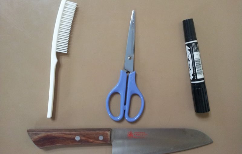 昔の人はうまいことを言いますが、これ鉄でなくセラミック、長持ちします。布も紙も はたまた髪も糸も自在です。右端驚く無かれ6年間使用のマジックインキ。本当にマジック・・打ち出の小槌じゃないけれど未だ充分、それもそのはず週2回のゴミ袋を出す際、住所と名前を書くときだけ。 最下段は包丁 本当に包丁1本・・・・・で