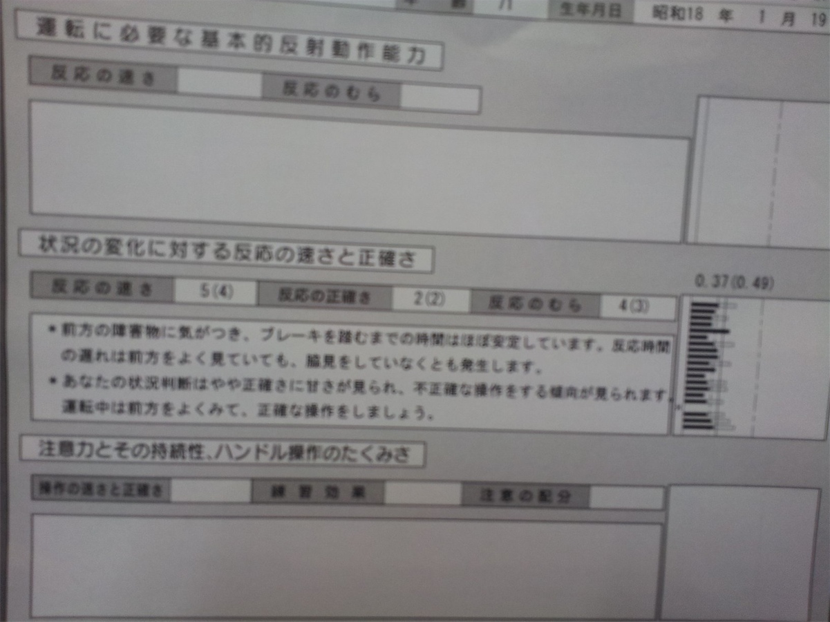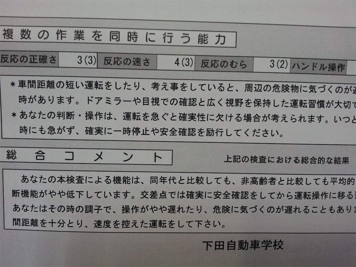 本人とすれば運転時間運転距離が多いのだからと自らを納得させているのですが「下田自動車学校」で各種能力確認、運転実技確認をしていただきました。大西社長、川口校長お二方と終了後 もみじマークを購入して私の能力確認話に華が咲きました。 私生来「トリ目」ですから暗い所に入るとすぐに見えないのです。同年輩の人18秒って人居ましたが70代は60秒くらいで暗がりでも見えるように「ところが私80秒」子供時分から「幕末だったら暗殺される、暗い所気を付けよう。」と70代まで参りました。