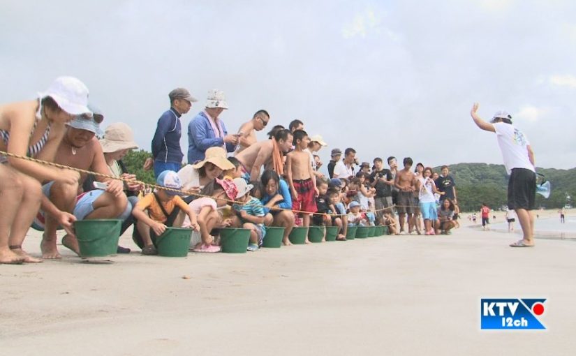翌朝 地元の人や海水浴客に見送られて こがめの旅立ちです