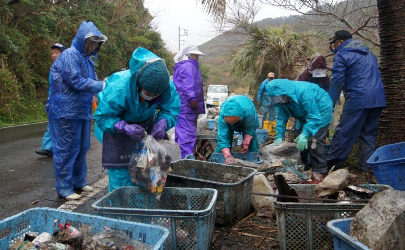大人たちも児童生徒に負けていません、石廊崎の道路清掃、ゴミの山を片付けて、さあこれから観光地石廊崎の復活です