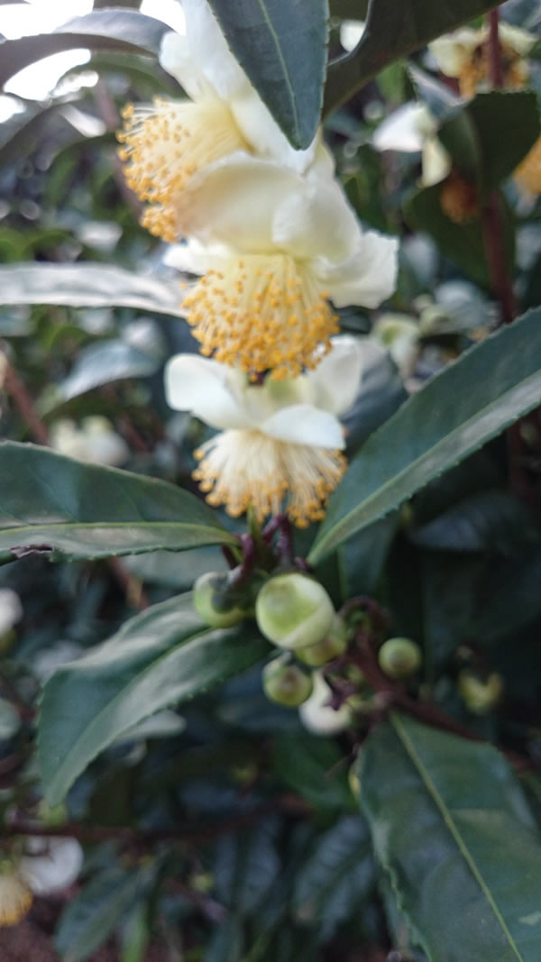 今 周りの茶畑は白いお茶の花が咲いています。茶畑に囲まれた中でせっせと草取り
