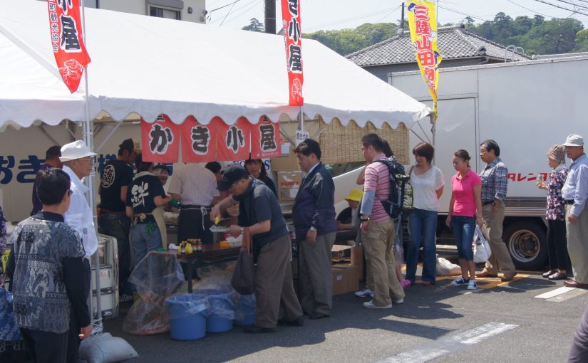 良かった NPO法人にぎわい社中の楠山理事長が音頭をとり「岩手県山田町の方々をお迎えする前に一度行こう。」と言うことでバスで13時間、でも山田町の方々も売店を出す関係で同じ道のりをバスで。 でも顔見知りの関係で和やか和やか! かき小屋は終日お客の絶えない忙しさ 勿論弊社みんなの広場も・・・