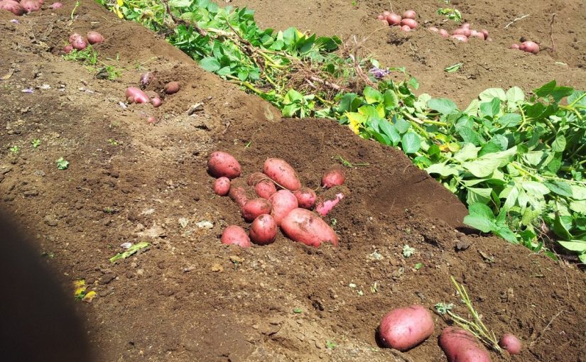 畝の間に葉っぱを埋めて 芋を掘り起し しかし万能鍬の威力は