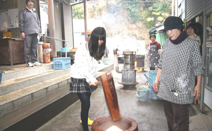 施主田島君のお嬢に高校の同級生、ギャル連3人の揃い打ち、お二人のギャルは始めての餅つき、きっとで来年は良い年になります・・と周りの連中 賑やか賑やか