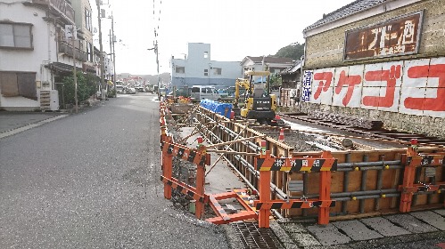 下田市三丁目、土籐商店前ポケットパーク建設地、立派な基礎でお金もかかる、後ろの土籐さん宅「伊豆石の建物と昭和の看板・人気高し!!」でも役所発注事業ですとお金かかりますねえ、民間ベースで対応すれば「...