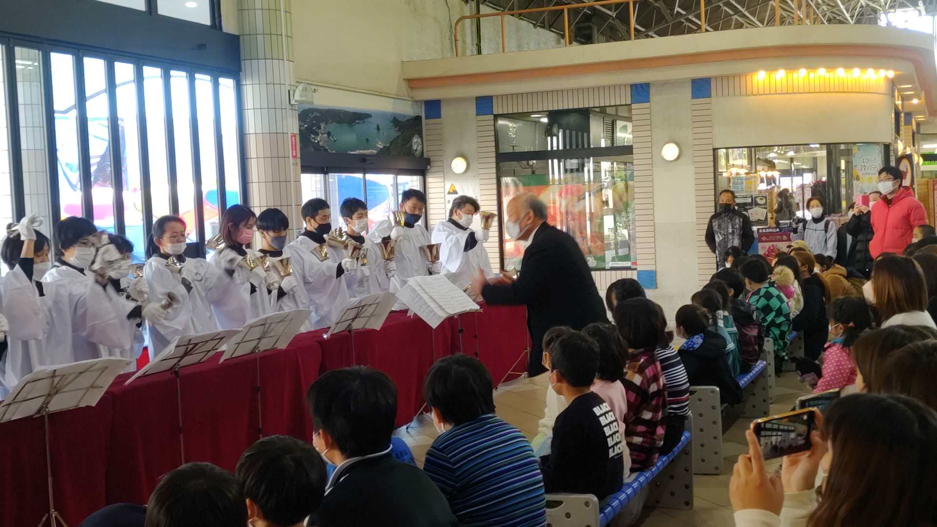 下田駅ロビーでハンドベル、クリスマスです。 12月25日風がないホカホカ陽気、昨日までの西風止んで人出もあり賑やか、ハンドベルをご披露される保育園の先生方、前列の長椅子には子供達穏やかな下田駅でした。