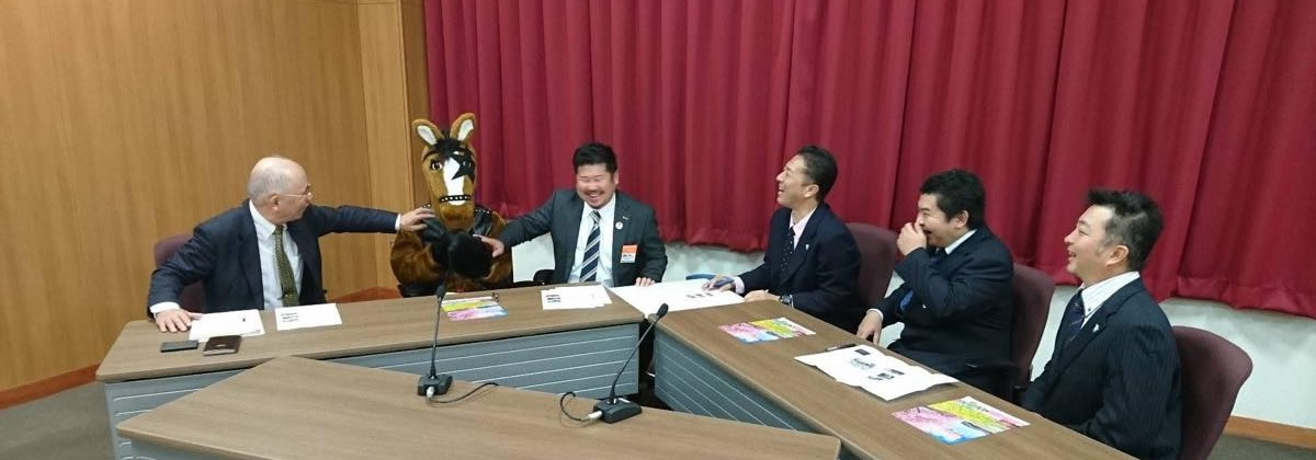 12月12日南伊豆町と西伊豆町商工会青年部の部長さんと副部長さんの座談会 南伊豆商工会OBの加畑議員の仲介進行で顔馴染事業熱心な方々のお話し、締めは「馬ロック」の衣装(松村副部長)に即興で鈴木部長のア...
