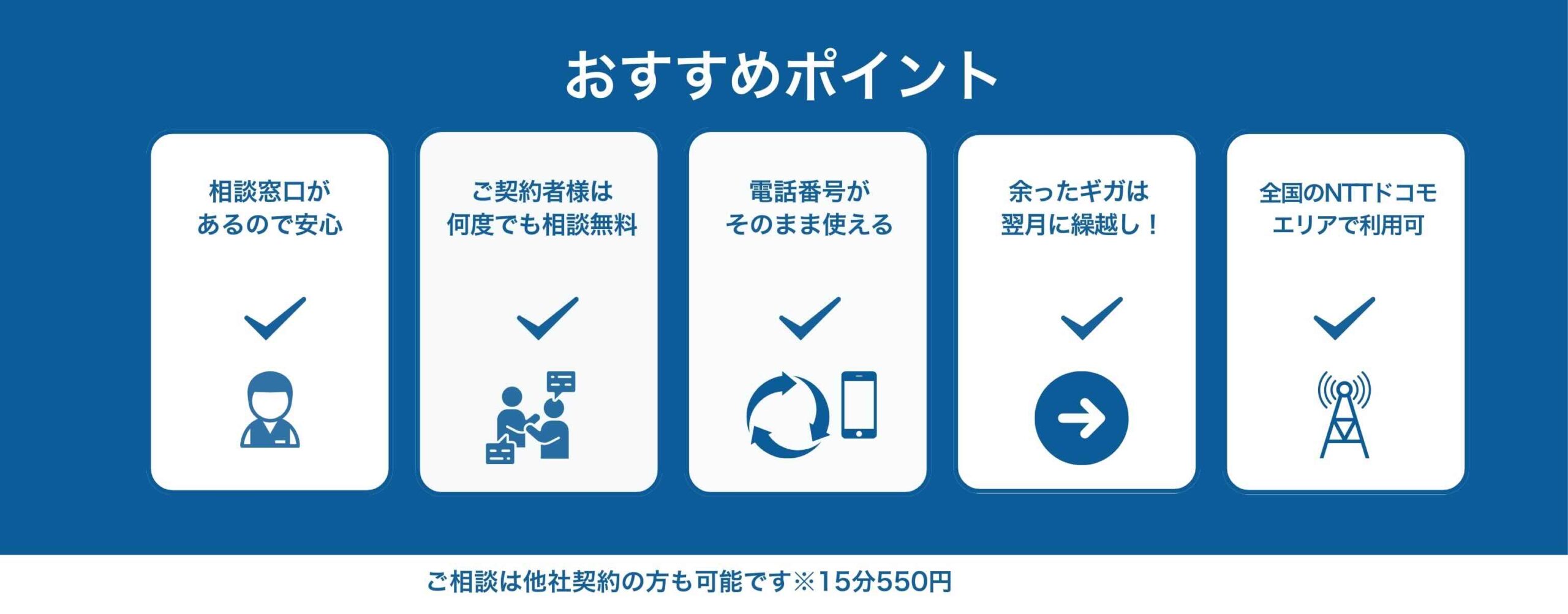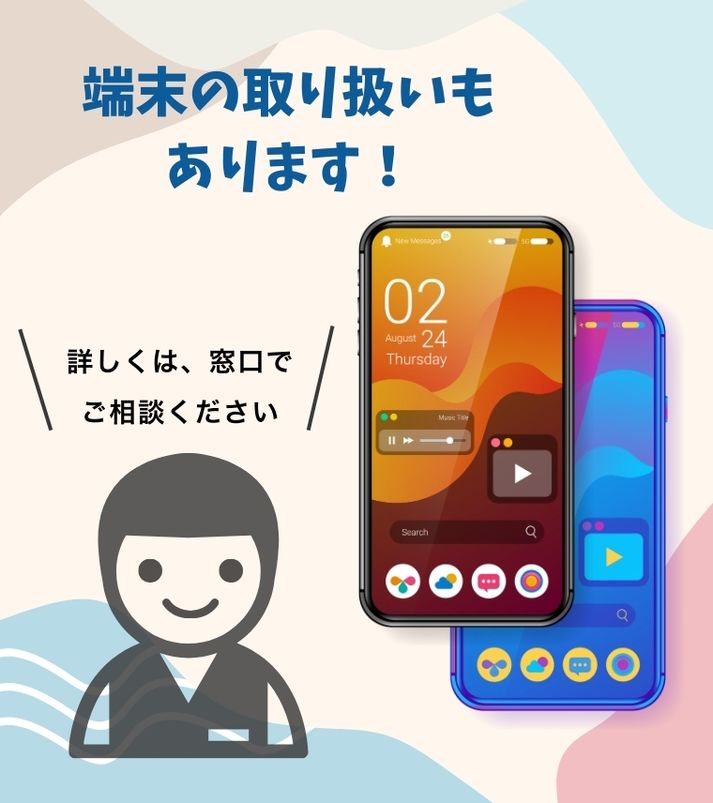 ご契約後も、実店舗の窓口があるので、わからないことは直接聞けて安心。スマホが苦手な方にも、丁寧にご説明します。ご契約者様は、無料で何度でもご相談いただけます。他社契約の方も歓迎です(15分/550円で相談可)。