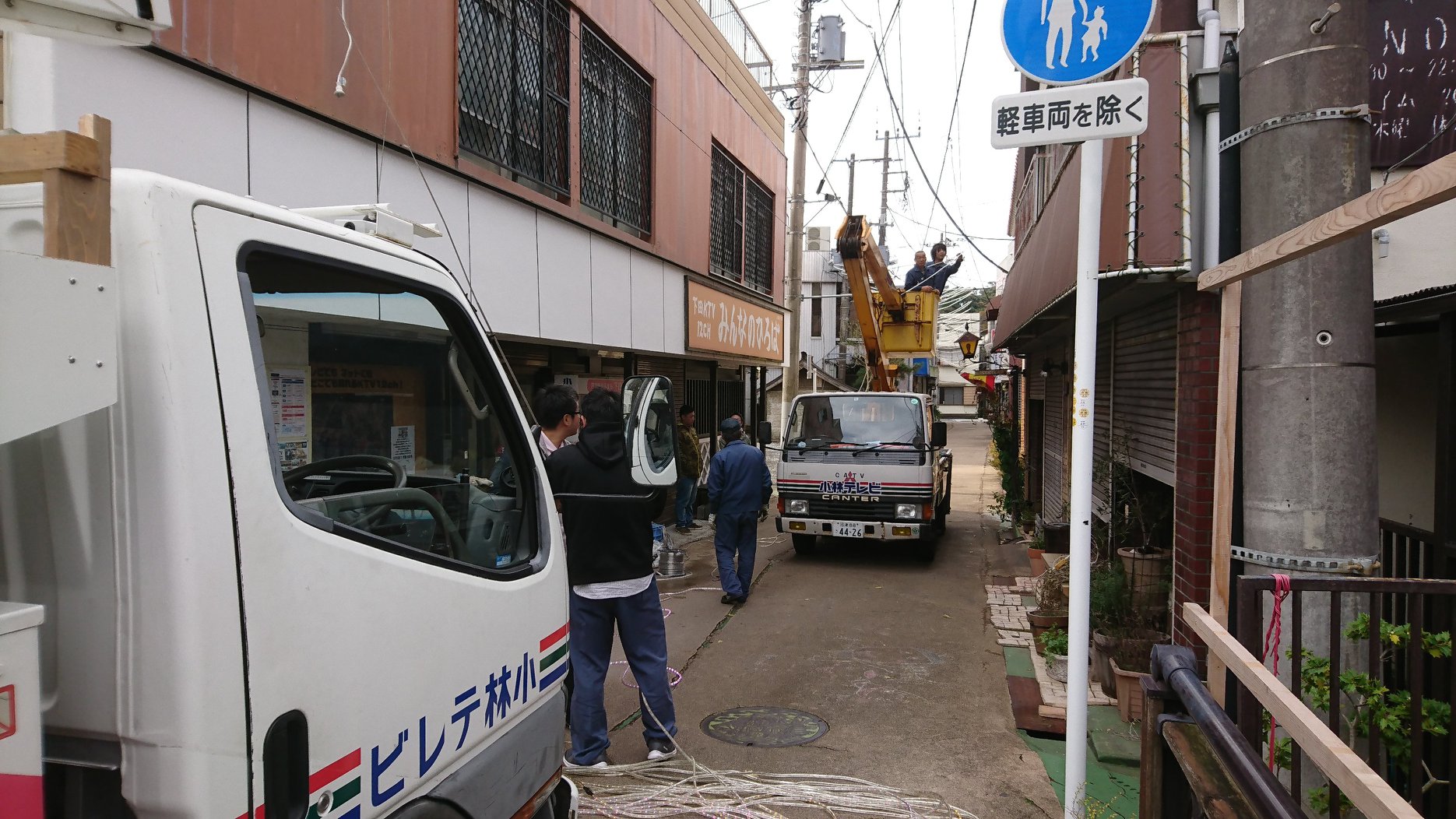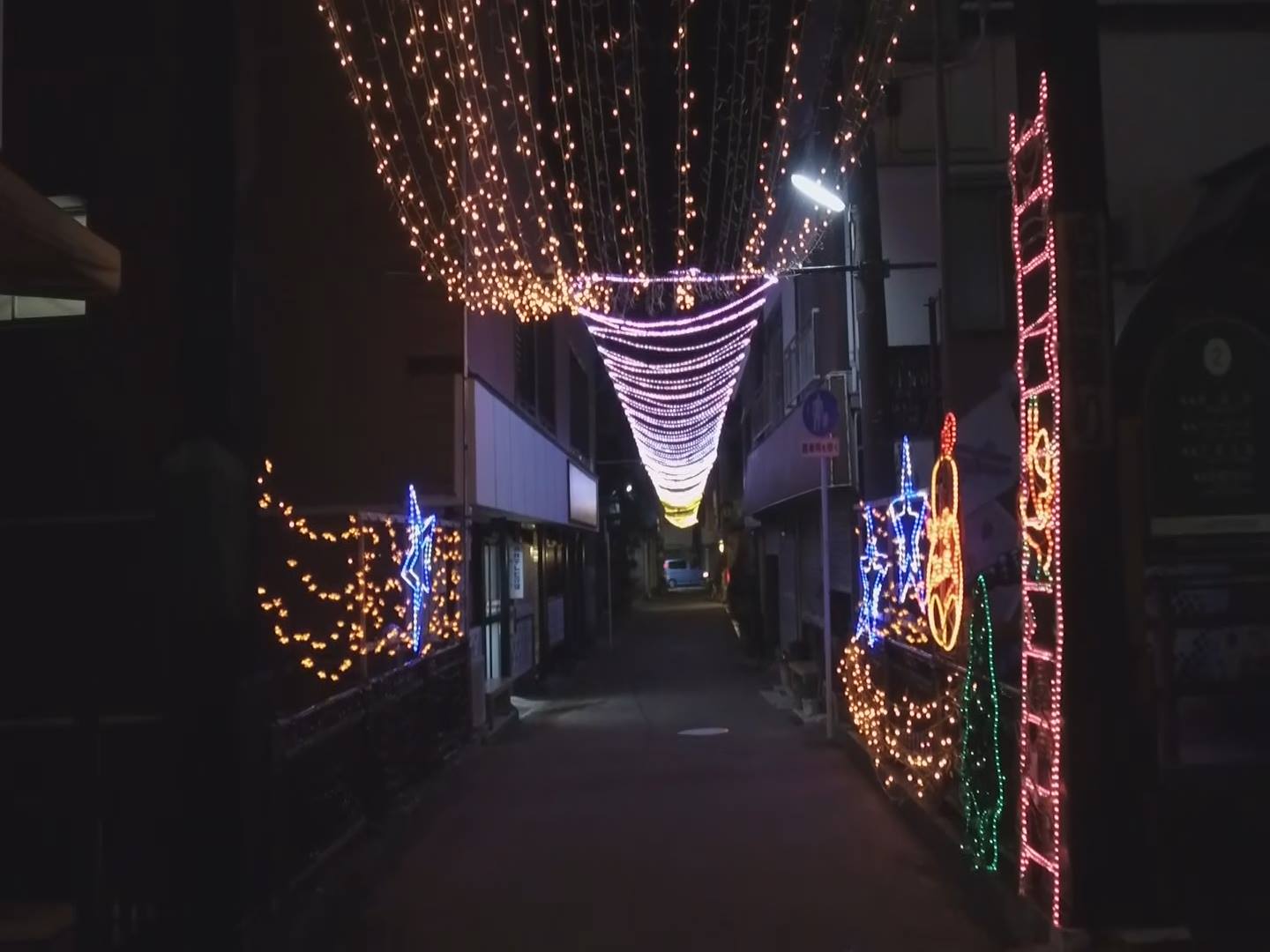 いよいよ年末 少しでも賑やかに 下田駅前香煎通り、恒例となったイルミネーション設営、高所作業車もあるし電気工事はお手の物、それでも7人で3時間、挙句点灯しないところもあって・・・ご苦労サンの巻。上にぶら下げた秘密兵器手のひらサイズの優れものが地面に画像を映し出す!
