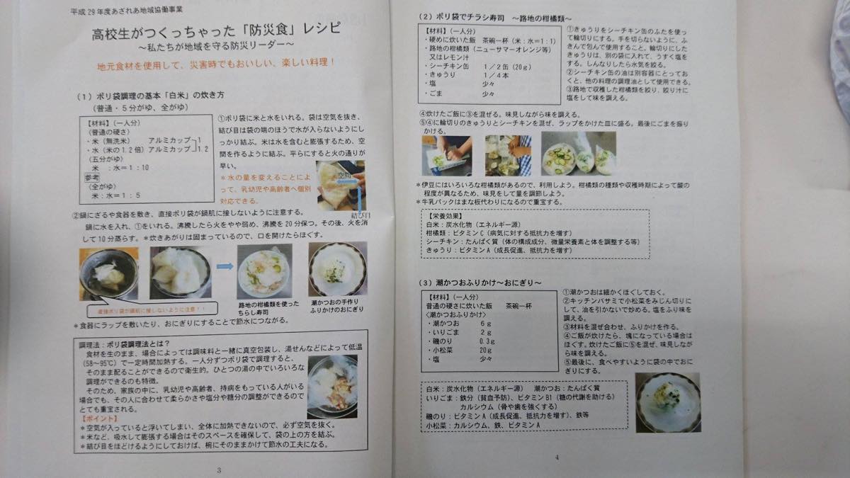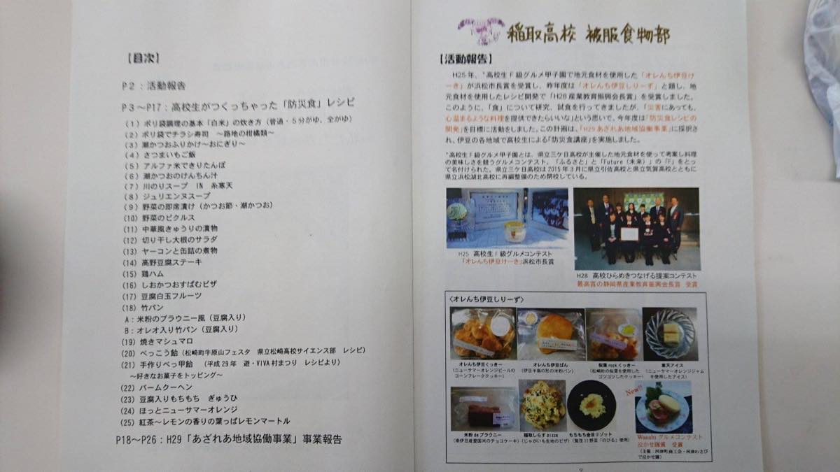 1月12日稲取高校で避難パーティー 大事なことを教えていただいた。避難場所での食事には個も考える高橋先生と生徒達、人数多くても食べ物にアレルギーの方が居る事を想定、且つ楽しい食事を有る物で作る、工夫と研究に頭が下がりました。そして万が一の場合、みんなが被災者であると共に支援者になろう精神、土曜日お休みの日に生徒会長はじめ生徒達凄い、教えていただいた調理ビニール袋で名前を書いて一人づつお鍋に入れて、鍋につくと熱で破れるため、ざるを入れて。缶詰の蓋を包丁代わりにして。素材に触らず調理完了・・手際よく仕上がる・・締めはワニョと高橋先生&女生徒のラジオ体操でした。画像は満載ですが素晴らしい学校と先生と生徒ご覧下さい。