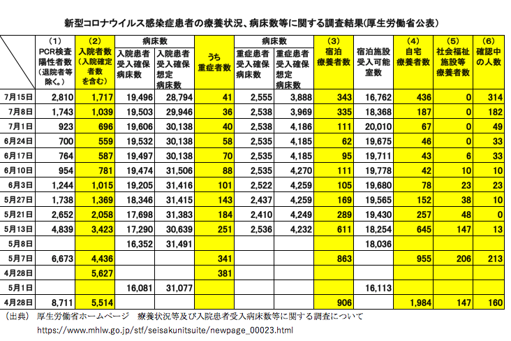 コロナウイルスに心配しながら「お客さまいらっしゃい。」 小さめで見づらいでしょうが左表は厚生労働省が週ごと公表している時点・時点のPCR検査・入院者・重症者・自宅等の療養者推移です。