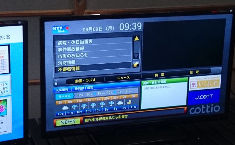 当地の天気予報から気象警報、海の様子から豪雨などの状況も判るようになっています。県の各局や海上保安部・警察署・消防署からの情報も文字でお知らせします。勿論下田市・南伊豆町からのお知らせも文字伝達いたします。 片方では海や道路の情報を定点カメラ15か所の画面をご案内して「道が通れるか?何処が混んでるか?海の凪はどうか?」テレビでもスマホでも見れるようになります。 またこんなDATA放送の中に暇つぶしや気分転換用に「麻雀ゲーム」も出来る様になっています。これら数々の情報が発信元からパソコン入力でDATA化されていきます。現在ファーストメディアが監修している「全国避難所ガイド」というアプリについては県の危機管理局でチェックをしていただきました、次に市や町の細かいDATAを逐一追加して全国一の内容にしたい。すると当地在住者のみならず都会から見える方にも当地案内が出来る様になりました。そのためにも賀茂に特化した情報を纏めようとしているのです。