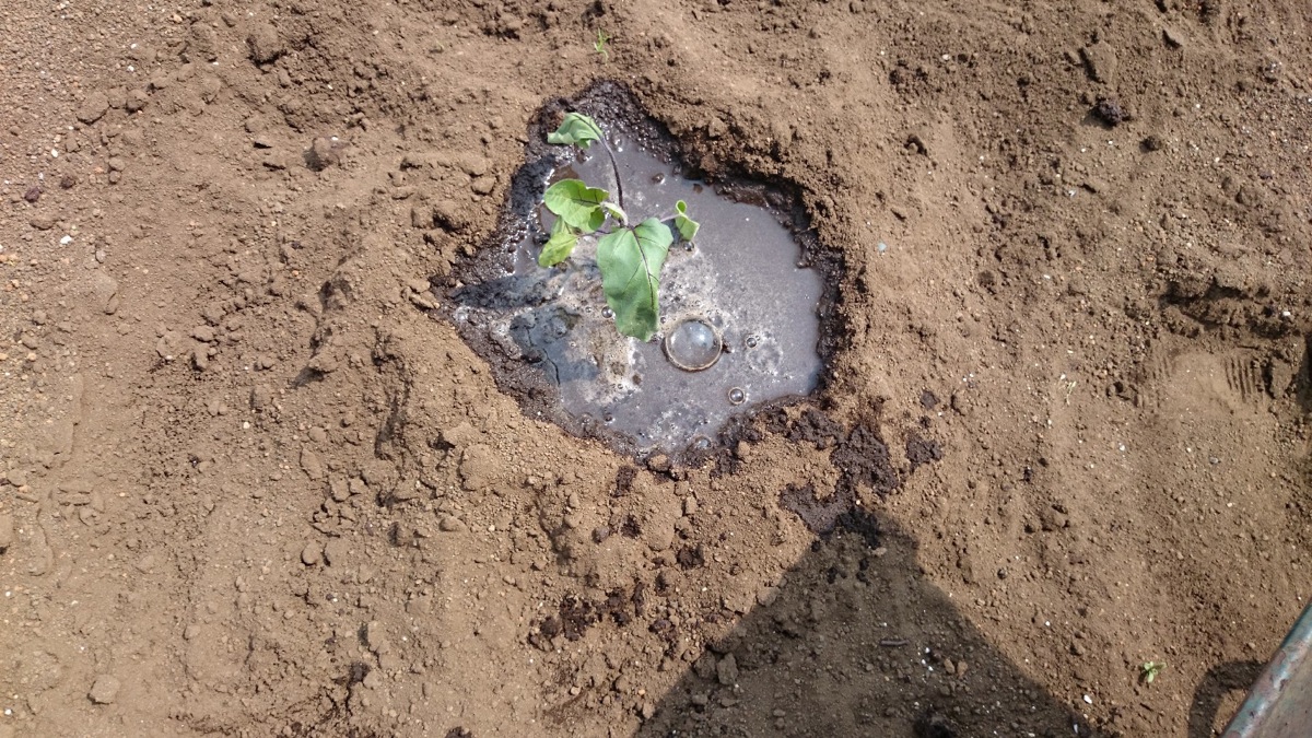 筋蒔きして土をかぶせて苗を植えて土手を作り水を そーだね1杯3リットル