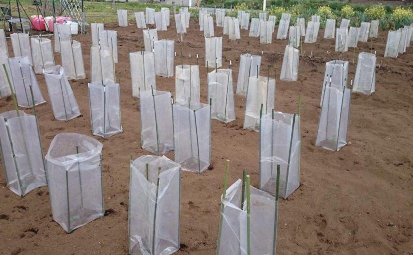 昨日残した風よけのビニール掛け85本 かけ終わり、さあ空いてる部分を耕運機で