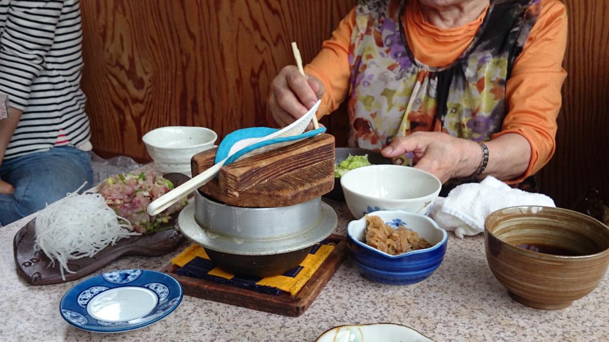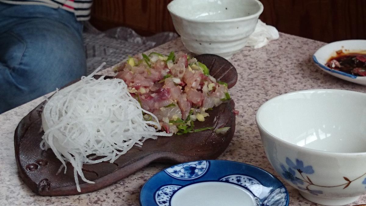 ここでの腹ごしらへは長八美術館前のさくら家さん あじのたたきは絶品 何より若者人気の品 理由「ナマをおかずに食べて半分残してまご茶。」ボリュームたっぷりだから高齢者