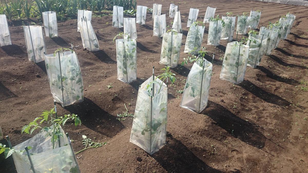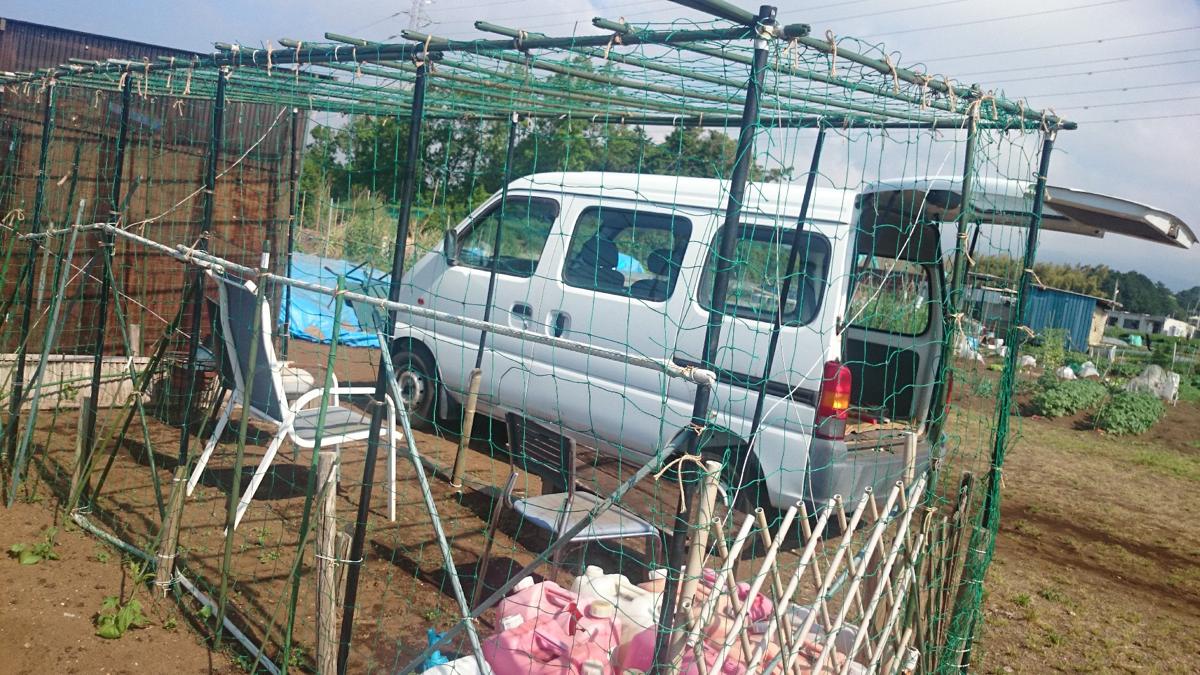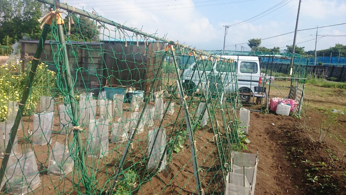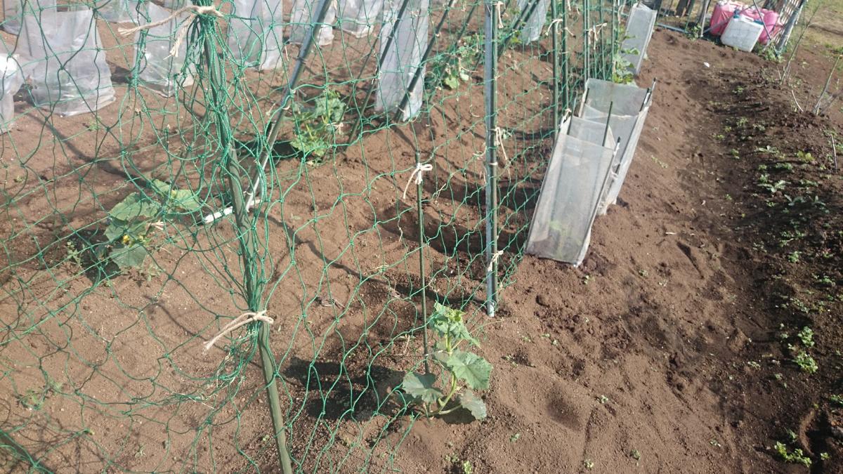 トマトは風よけビニールを追い越して上に伸びたけど時間切れのため