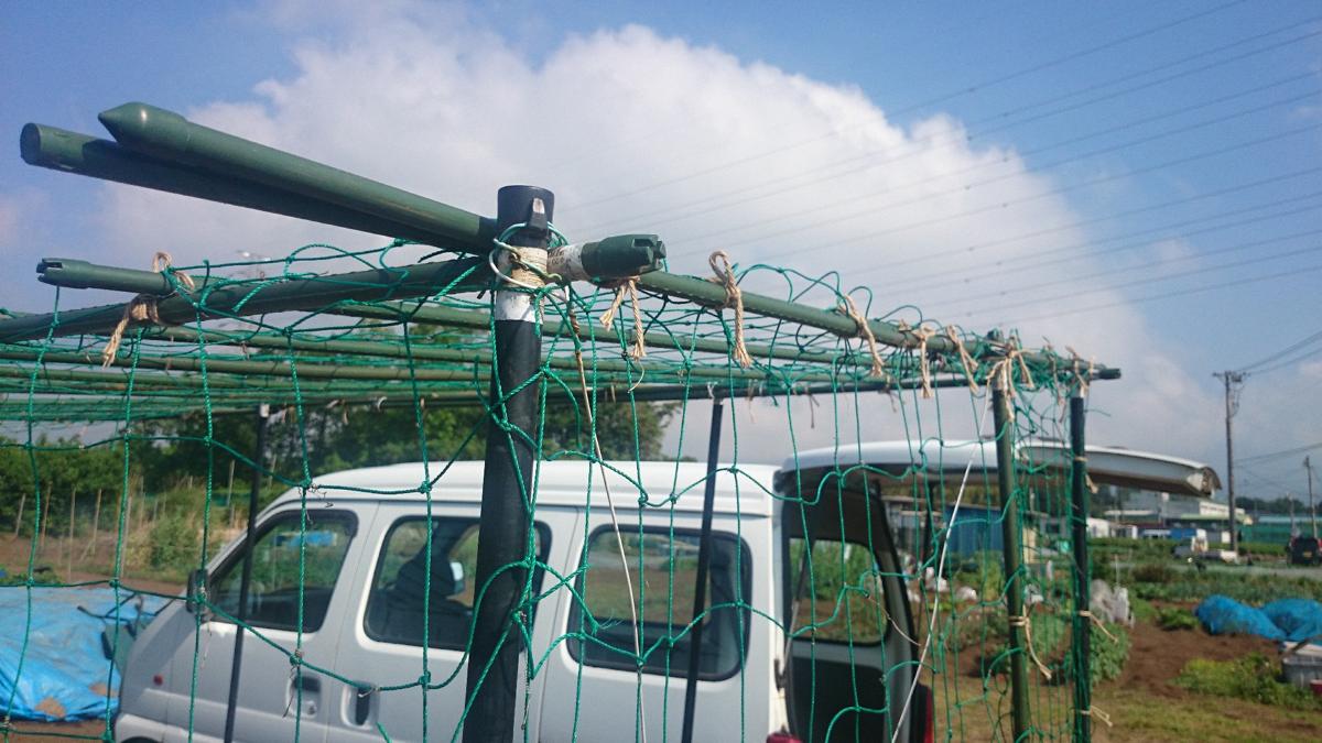 ごーやの棚を作り キュウリの棚を作り これは全部麻ひもで縛ります