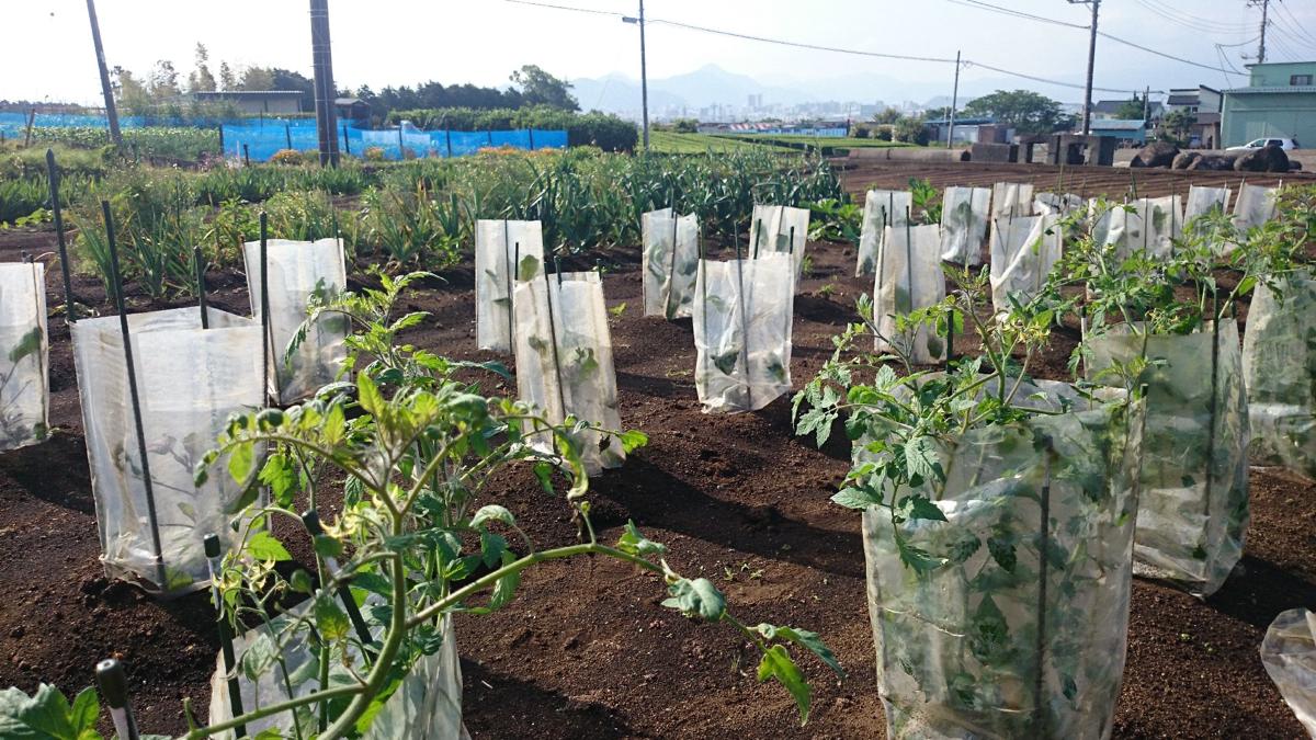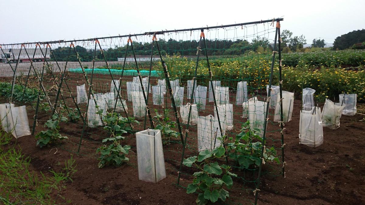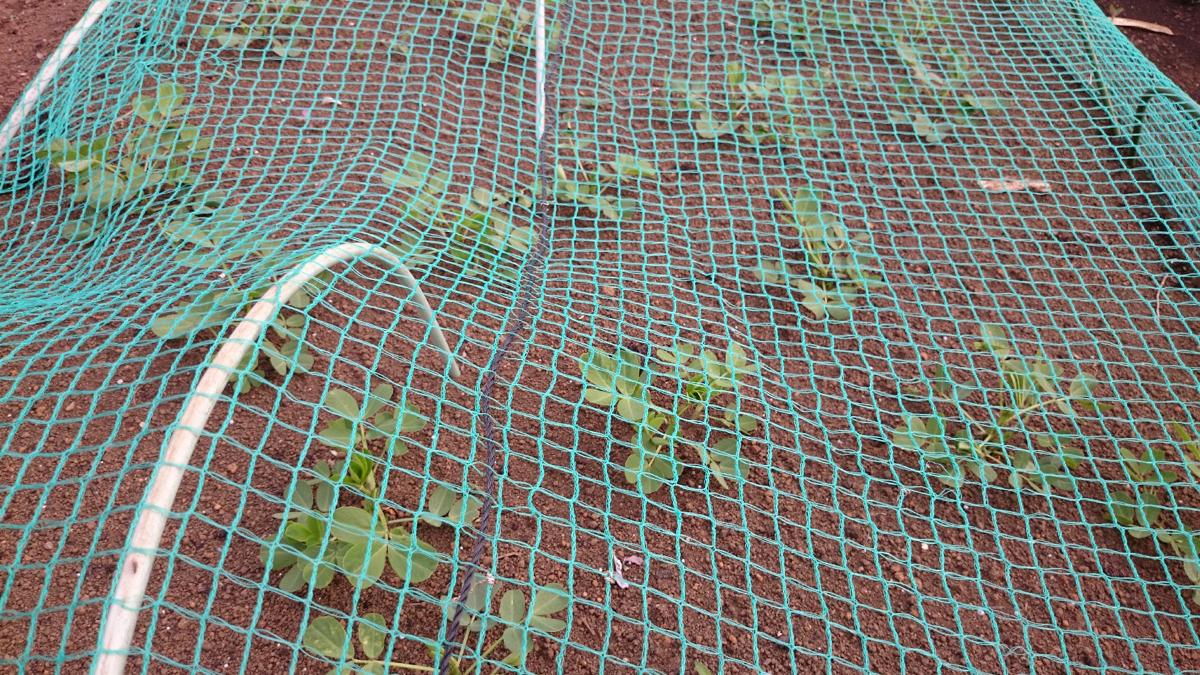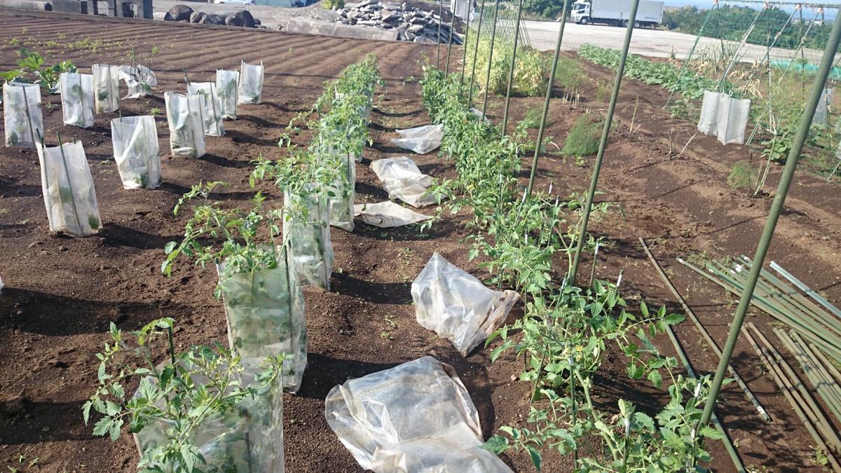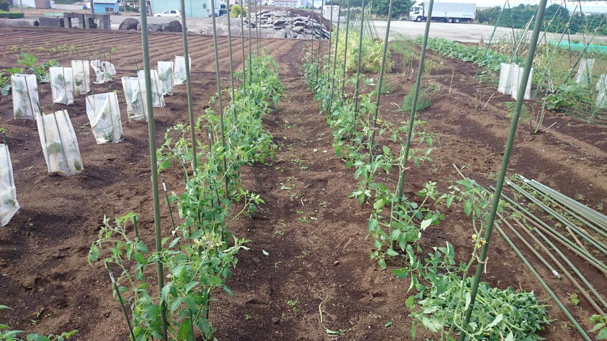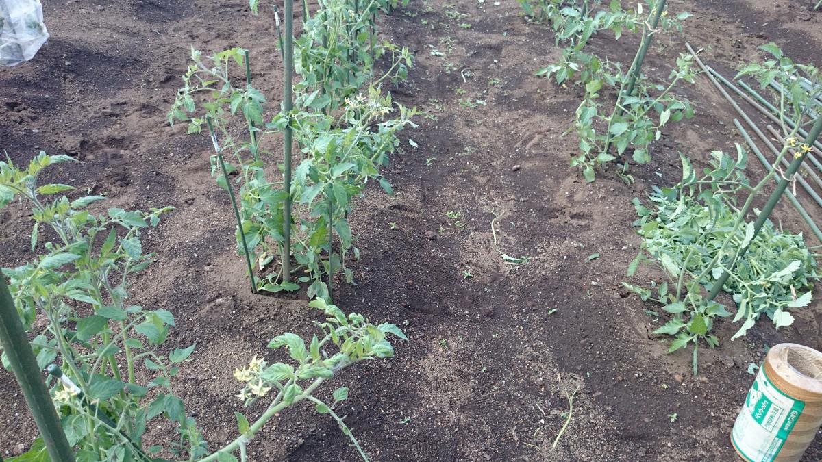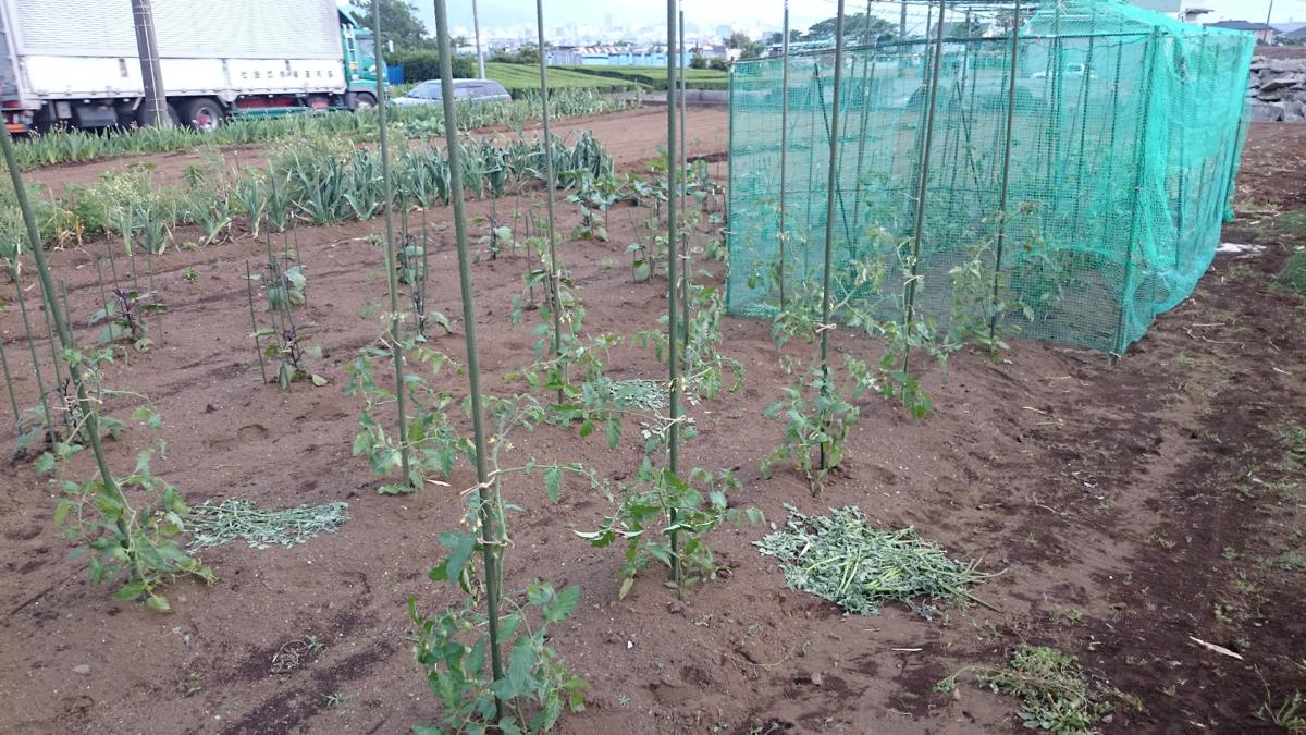 トマトが風除けビニールからはみ出してひょろひょろと背だけ伸びて、芽を摘んでネットをかけて これが難儀です ミニトマトは鳥が狙わない、桃太郎だけは狙い撃ち、毎年鳥よけにネット張り、それにしてもビニール風除けの中ではトマトひ弱だ。何にもしないでおけば丈夫に育つんだが何せ風が強いので上に伸びるものは最初だけサービス、キューリも最初は過保護、そうナスもピーマンも・・・