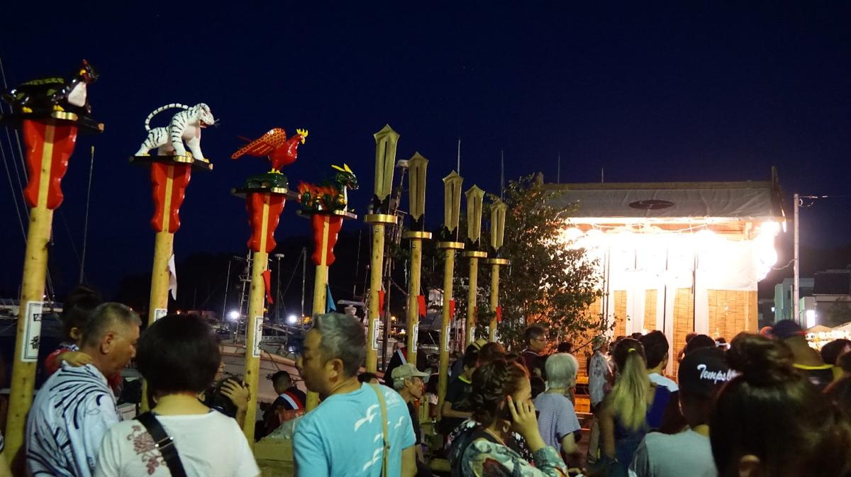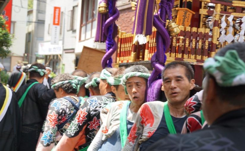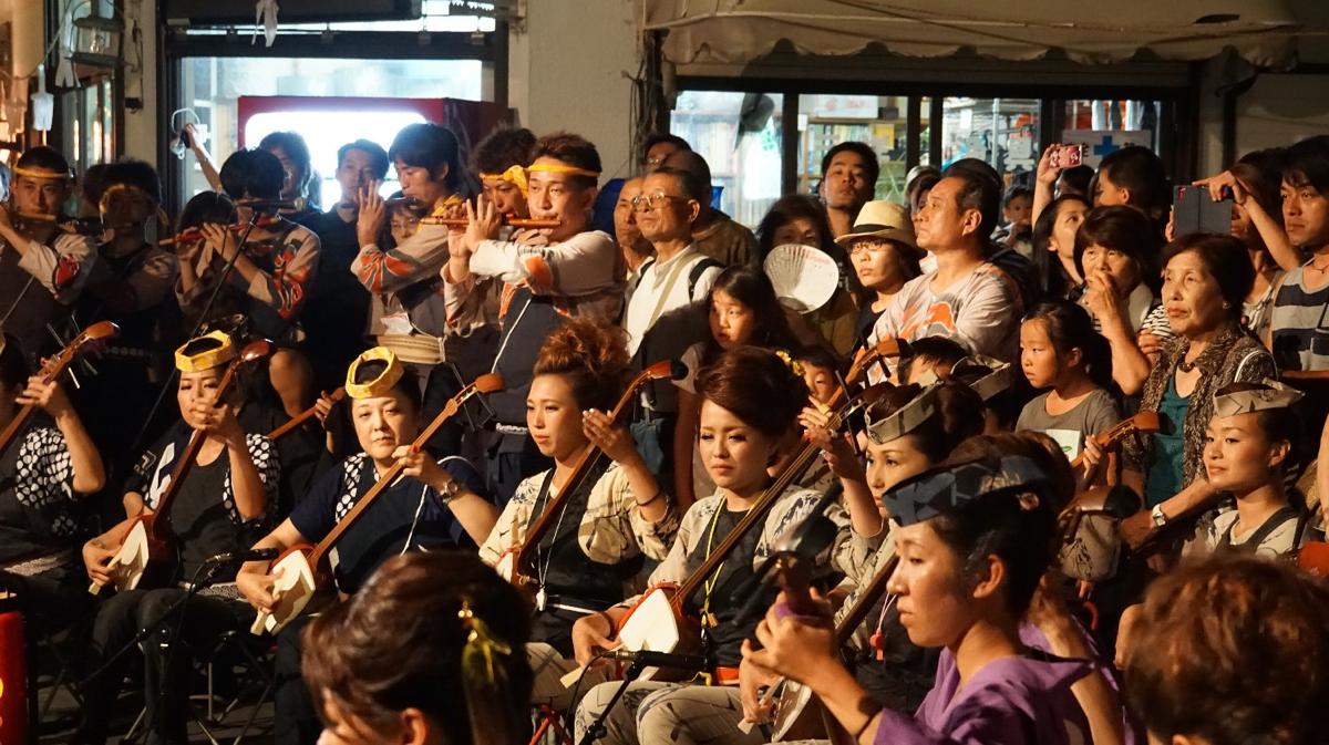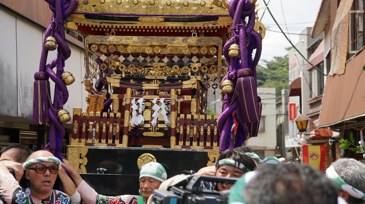 ブログ 下田八幡神社例大祭 2015年8月16日 by KTV-12ch 例年のことながら 二日間街中祭り一色 撮影班も忙し忙し 会社の前に神輿が入ってきました 何せ800kgもある神輿 下田は道路が狭いので 担ぎ手の棹は縦棒二本、そのため担ぎ手は 20人前後 そりゃー大変 女性陣は笛・三味線 若い衆は太鼓台と太鼓橋 神輿は中老担当。