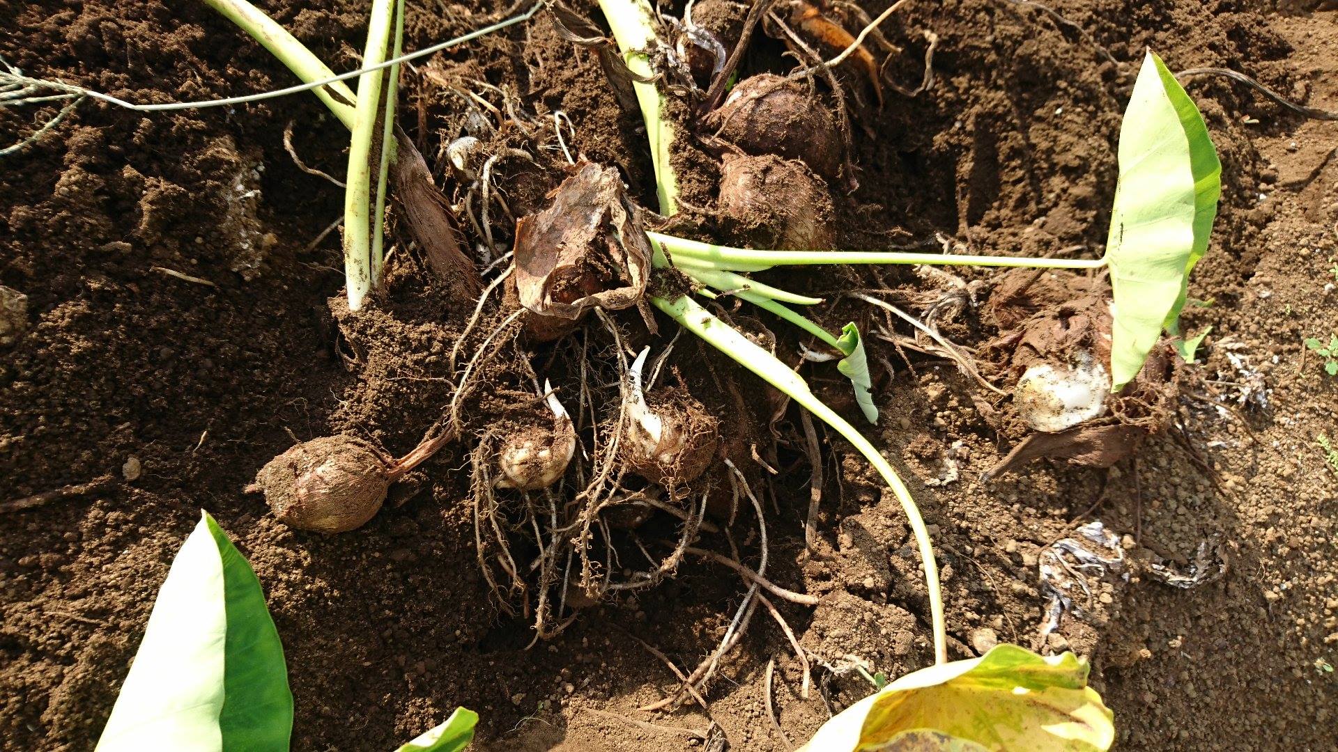 9月10日ためし堀り なると金時イモと 里芋は下田での地紅茶サミットの際、埼玉の方から戴いた里芋。里芋はちょっと早いなあ!でも沼津の畑も里の秋だ。