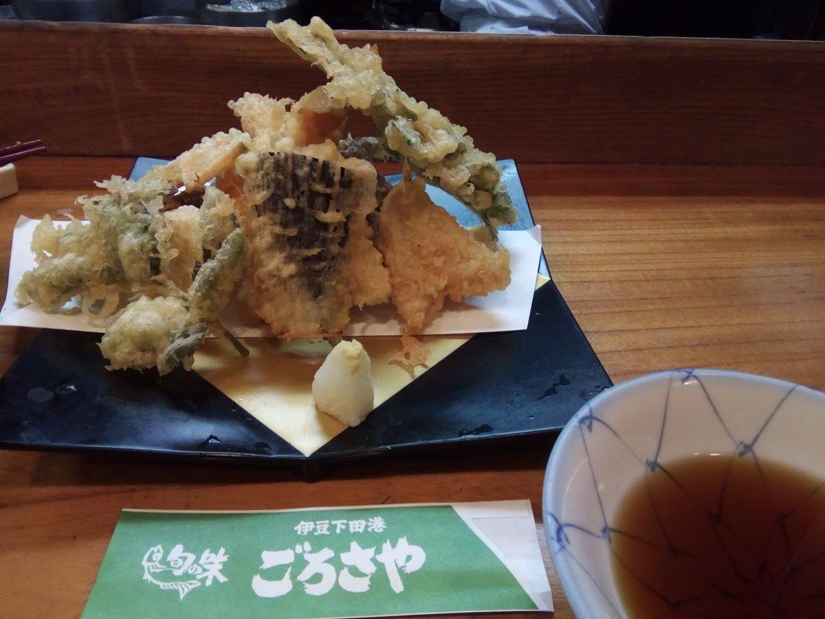 2月24日下田・ごろさや きんめの煮付けとお刺身 それに天ぷら盛り合わせ 絶品 2月中満席です が カウンター席あります 看板 聞けば雪の国から桜を見て温泉に浸かるお客様も