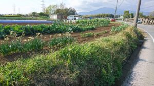 4月24日現在、植えたもの、撒いたもの、収穫間近のもの。東から西へかぼちゃ・五月豆・絹さや・グリンピース・根深ねぎ・にんにく・ほうれん草・人参・大根・トマト・ミニトマト・ナス・九条ネギ・唐辛子・ピーマン・パブリカ・玉ねぎ・じゃがいも・落花生・大生姜・谷中生姜・大和芋・山芋・里芋・ごーや・ししとう・いんげん。あとはオクラを植えるだけ。これだもの百姓が青くなるわけだ・・・自然発生待ちは青じそとつる首かぼちゃ。・・・
