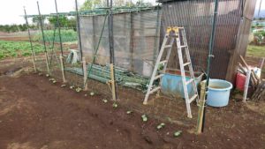 4月22日23日二日間で31,000歩 畑は良いなあ それにしても便利 鳥よけネットからハクビシン除けネットまで ゴーヤも植えたし 夏準備ほぼ出来上がり それにしても営々と豆類は種を頭の上に出して・・これじゃー鳥に狙い撃ち!!いつか種を下にもぐらせた状態で育つ奴が出るとよいのにナア??