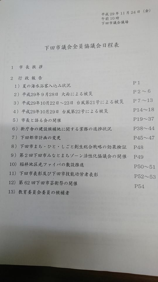 お知らせ/ブログ 下田市議員座談会 2017年11月26日 by KTV-12ch 11月24日下田市議員座談会 議員さん8人もご参加いただいて 市の全体協議会での行政報告と課題点についてお話を戴きました。今22,000人しか居ない町で「かくあるべし」は難しい。 当局も議員も市民も難しい。私が言う筋ではないけれどメディアに振り回されるな!!ここで生きて死んでいくものにとって 最善は?より良い事は?各問題について熱のあるお話を戴きました。年の代わりを目処にネット放映、ネットをテレビへ!! 進行します。