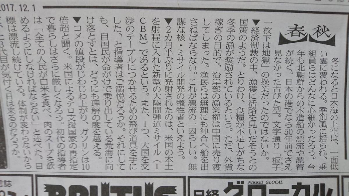 12月1日日経新聞春秋欄 北朝鮮は外貨稼ぎの目的で沿岸部