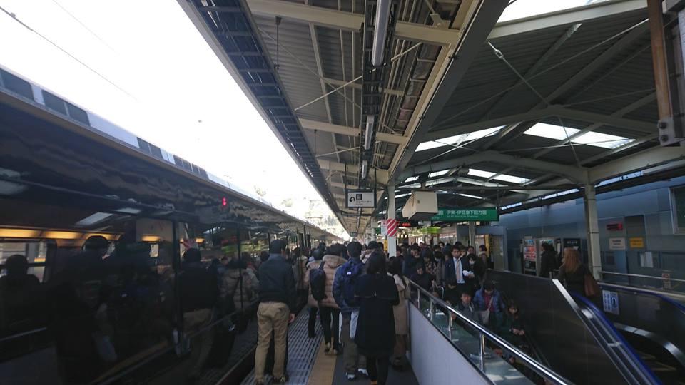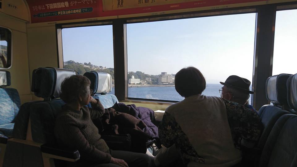 2月24日土曜日 伊豆急電車 下田より 河津桜で大賑わい 河津駅でお年寄りご家族に席を替わり 海側で喜ばれ 熱海駅の混雑に出会い 良いなあ混雑は 賑わい賑わい・・