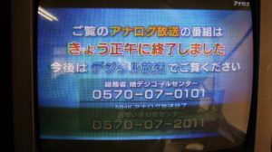 2011年7月24日カジキ大会翌日24日正午アナログ停波、あれから7年しか経たないのに今年の暮れから4K放送 受信機(テレビは今の侭でも見れます)高精細の4K必要な方は新しくテレビを買ってパラボラ付けて!です。4Kテレビでも以前の物はチューナー付けなくては見れません。でもご家庭の40インチ、今まで通りで綺麗ですものね、でもこうしたいああしたいはどうぞ問い合わせてください、高齢の私は応対能力に限界がありますが,おかげさまで若い弊社社員男女問わずバッチリです。4Kもスマホもネットテレビもどうぞ御遠慮なしに。これは当時の当日画像です。